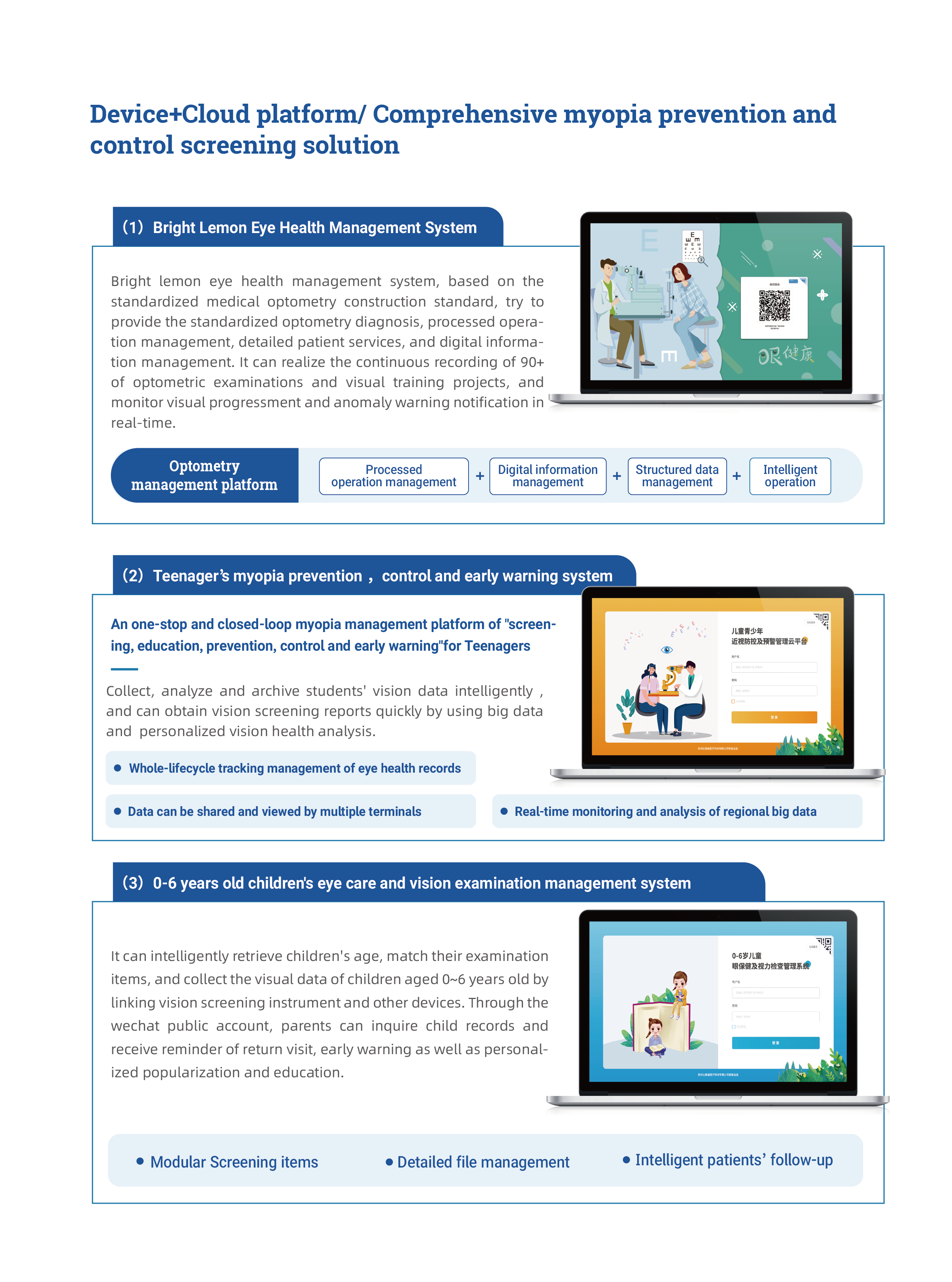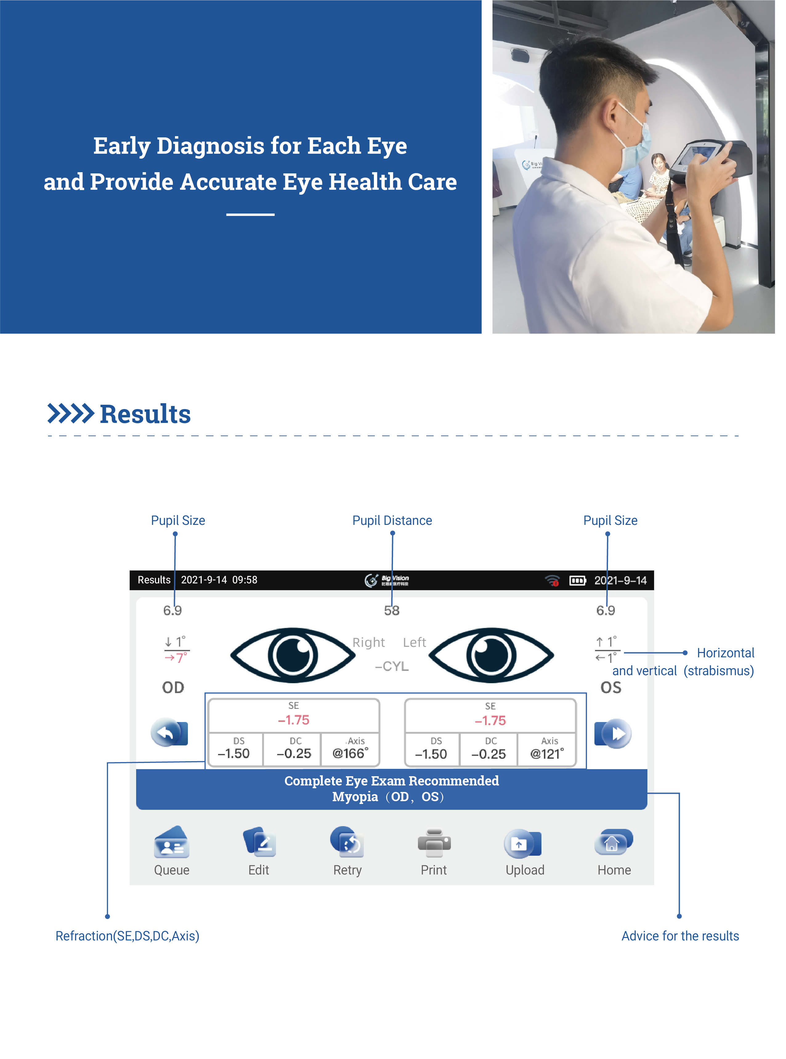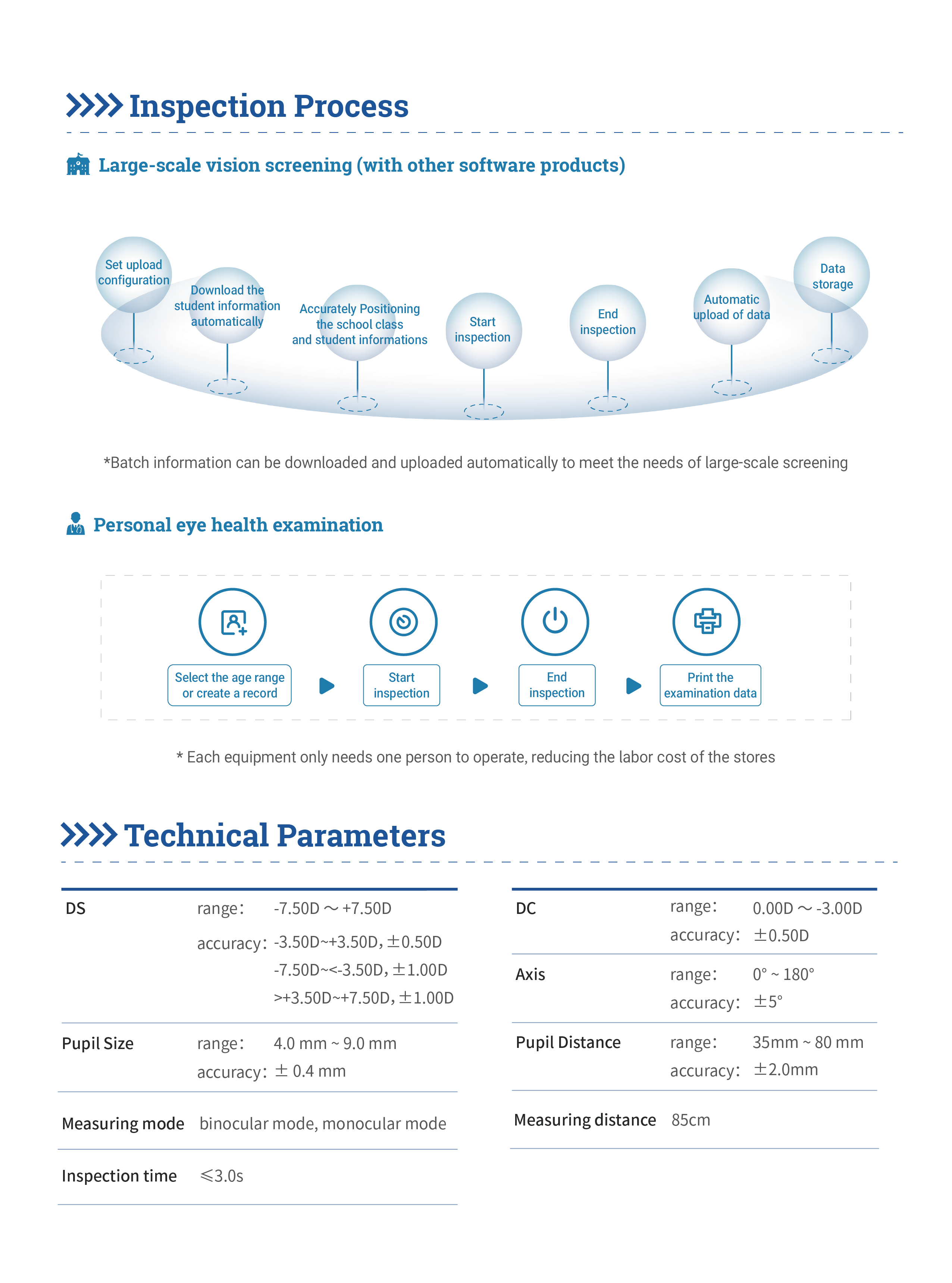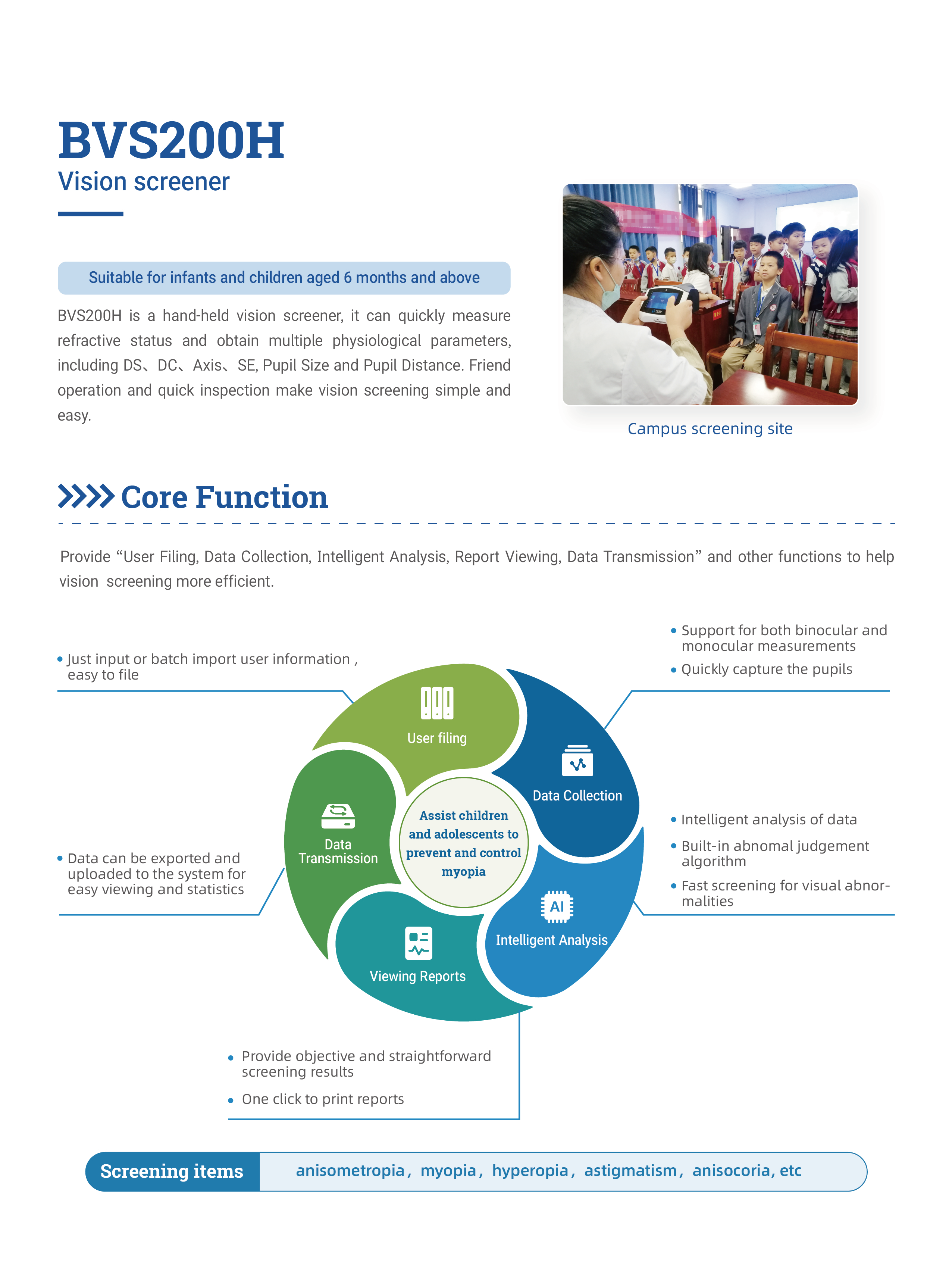 The BVS200 Series is a handheld visual acuity screening device suitable for measuring binocular or monocular vision in people aged six months or older. It can quickly measure refractive status and obtain multiple physiological parameters including spherical degree, cylindrical degree, cylindrical axis, equivalent spherical degree, pupil size, and interpupillary distance. The device is easy to operate and has a fast testing speed, making vision screening simple and effortless.